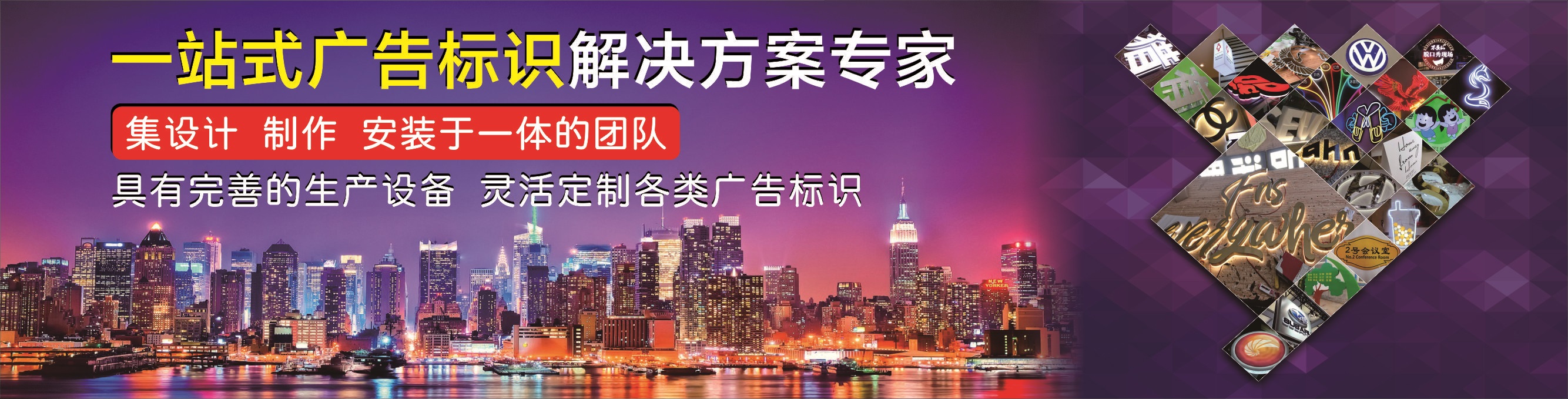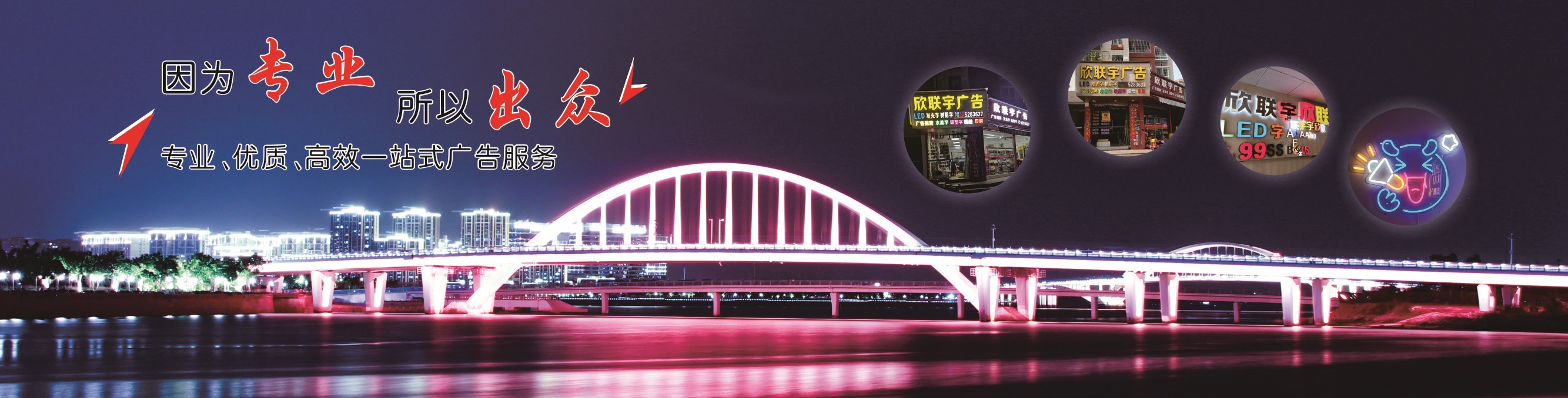 廈門欣聯(lián)宇廣告有限公司是集廣告設(shè)計、廣告制作、安裝一站式服務(wù)的廣告公司。專注戶內(nèi)外廣告制作:戶外廣告制作,樓頂大字廣告制作,墻體廣告制作,廣告燈箱制作,標(biāo)識標(biāo)牌,企業(yè)形象墻制作,文化墻,廣告牌制作,led發(fā)光字,led顯示屏,廣告噴繪等等。 廈門欣聯(lián)宇廣告有限公司,是一家擁有良好行業(yè)口碑的平面廣告機構(gòu)。我們的宗旨是“凝聚現(xiàn)代智慧、創(chuàng)作廣告精品”。我們用我們的專業(yè)為客戶打造優(yōu)質(zhì)的廣告產(chǎn)品。客戶的滿意就是我們的動力。 我們擁有多年的廣告制作經(jīng)驗,也在廣大客戶中樹立了良好的口碑。“想客戶所未想,急客戶所未急”是我們的服務(wù)理念。